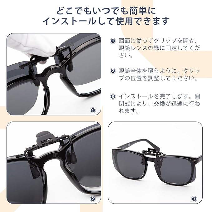 UV 400保護付き偏光クリップサングラス、高品質レンズ、防擦と防振。すべてのアウトドアに最適!