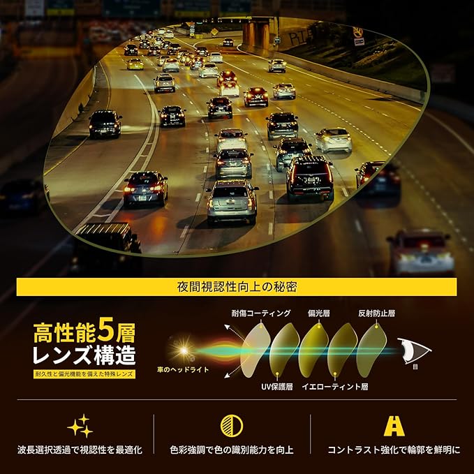 高機能レンズ&優れた視認性:5層レンズ構造(耐傷コーティング、偏光層、UV保護層など)で優れた視認性と耐久性を実現。UV400カットで有害な紫外線を99%カット。日中は眩しい日差しを効果的にカット、夜間は黄色レンズで視認性アップと、用途に応じて快適な視界を確保