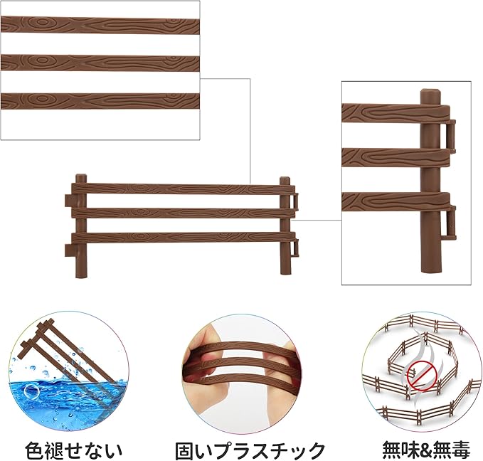 フェンスおもちゃ・24PCS:このセットには24ピースのブラウンのフェンスが含まれています。 フェンスのサイズは 15.3cm*6.5cmです。これらのフェンスおもちゃは、動物フィギュアの最高のパートナーです。