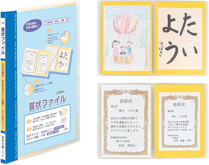 大B4判 八二(W273 H394mm)サイズの賞状や作品を綺麗に保管。ポケット底部は破れにくい二重構造。小さいサイズでも綺麗に収納できる三角ストッパー60片付き。収納枚数20枚。