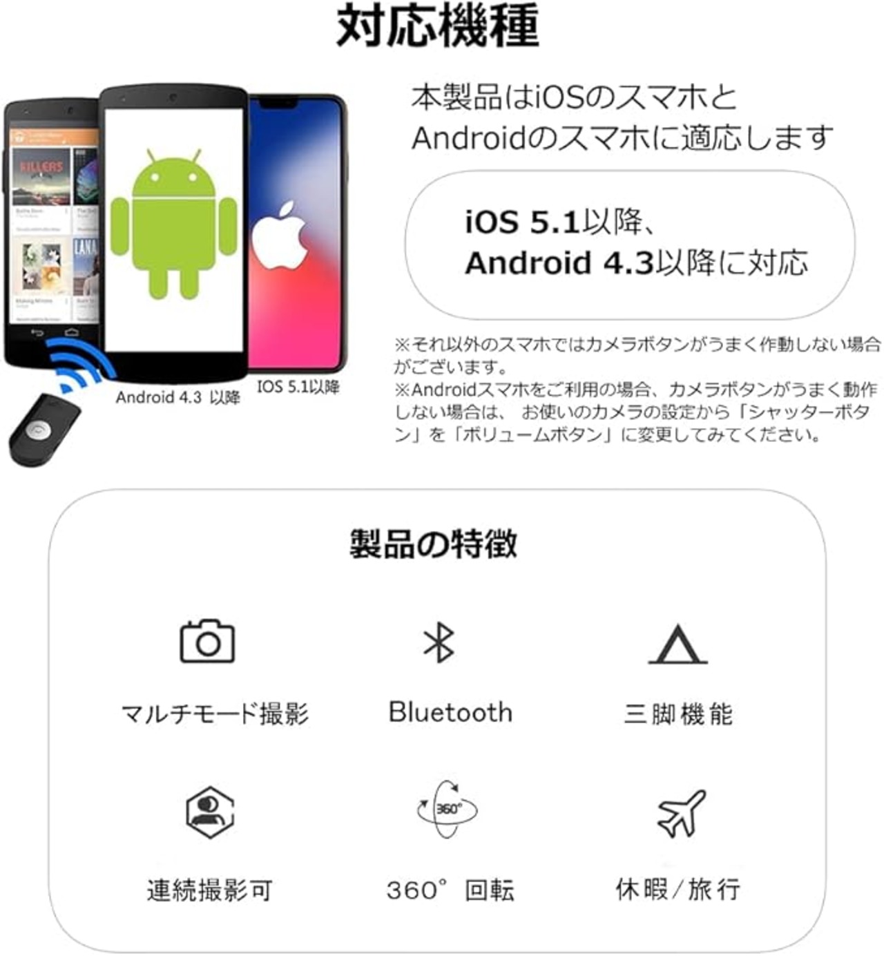 ・スマホにBluetoothとペアリングして、リモコンのシャッターを押すだけOK。リモコンは棒を少し伸ばすと着脱可能になります。