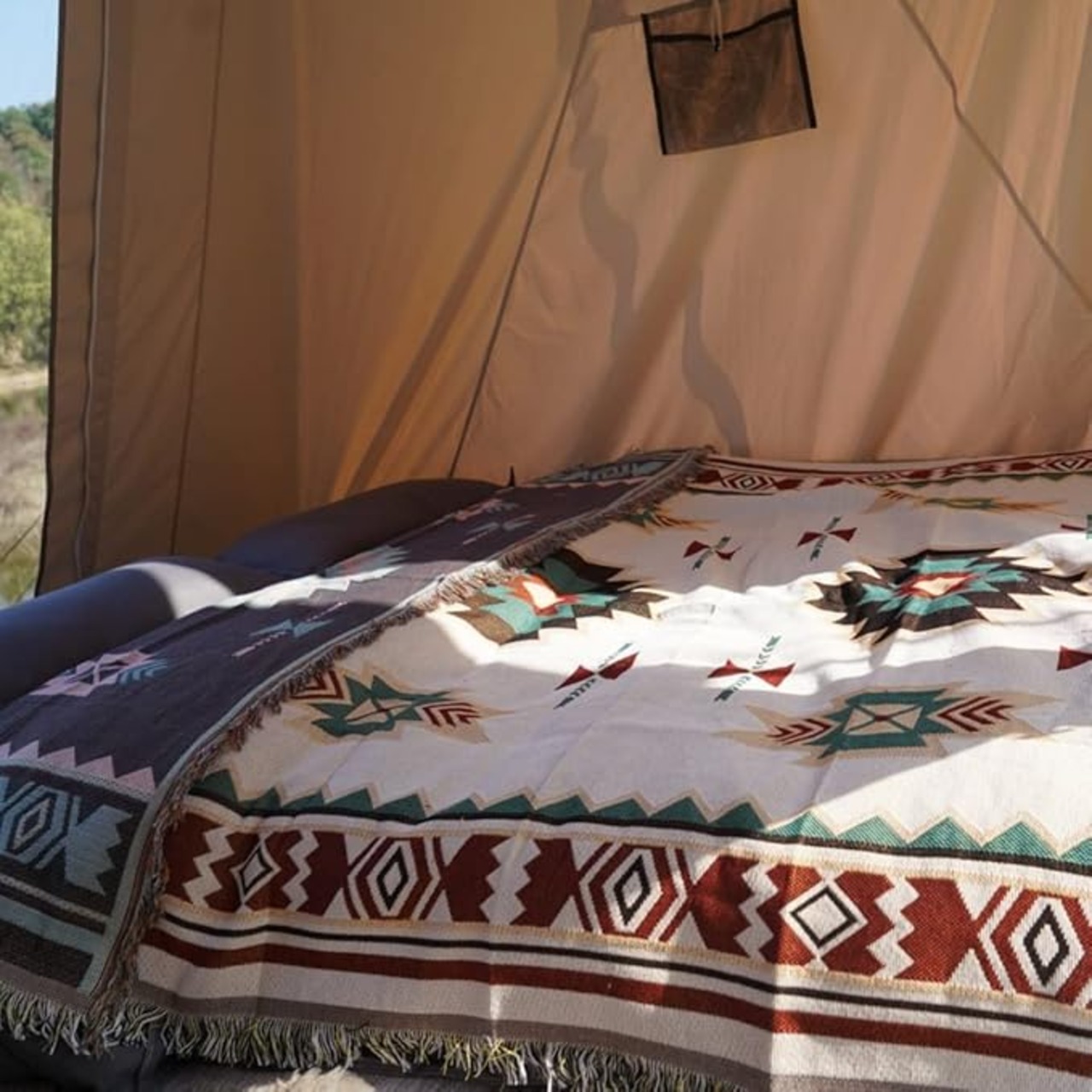 テーブルクロスとして活用しているキャンパーもたくさんいます。アンティーク調のキャンプ用品を置くことで、気分はネイティブアメリカン!