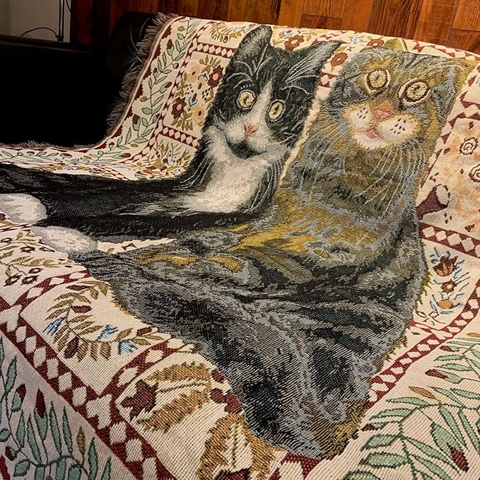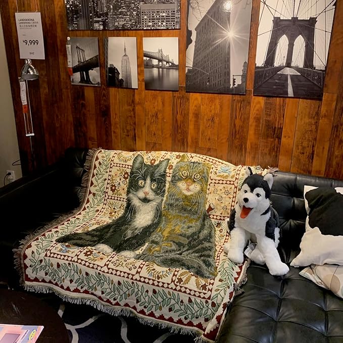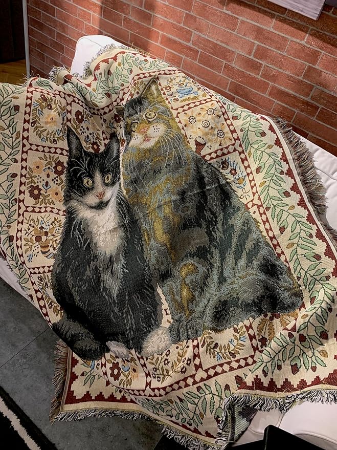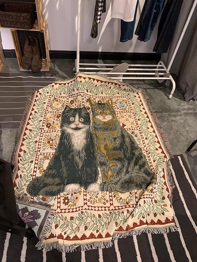 猫柄スローブランケット1枚、ヴィンテージファブリックスリーピングブランケット、ソファ、読書、オフィス用。