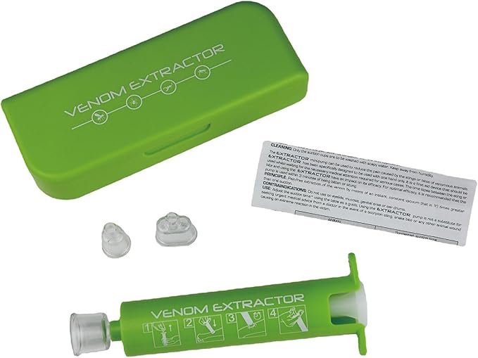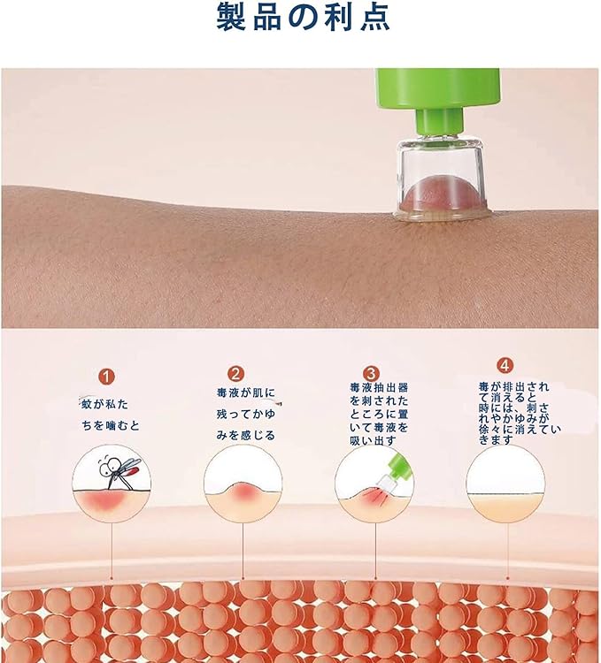 ポイズンリムーバーは、蚊、ブヨ、ハチなどの毒虫に刺された際の応急処置ツールです。 付属の大きさの違う3サイズの吸引カップで、プレンジャーを操作することで応急処置ができます。 目立つライムグリーンの丈夫なケースは持ち運びに便利です。 ケースには分かりやすい図解、日本語の説明書が同封されています。