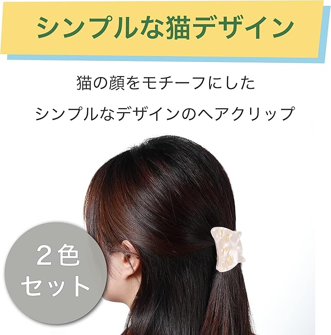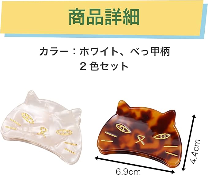 うれしい2色セット:シンプルなホワイトカラーと落ち着きのある色味のべっ甲柄の2色のヘアクリップが揃ったセット品です。猫モチーフの可愛いデザインなので、猫好きの方にもおすすめです。2色セットなので、コーディネートの幅も広がります。