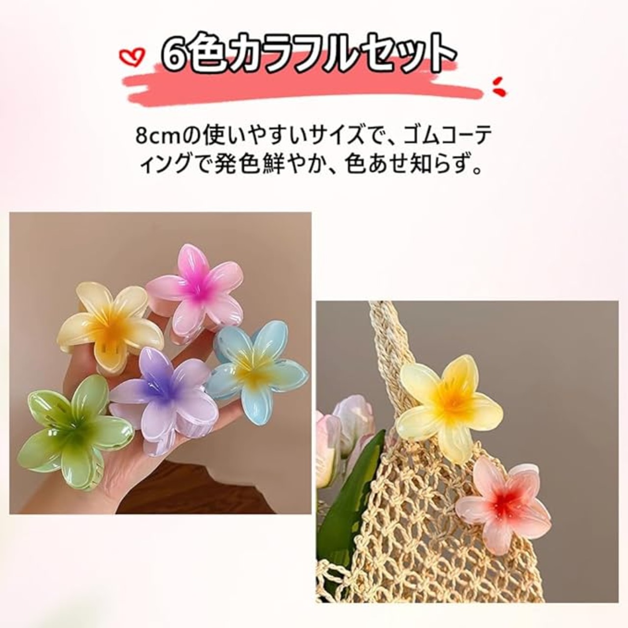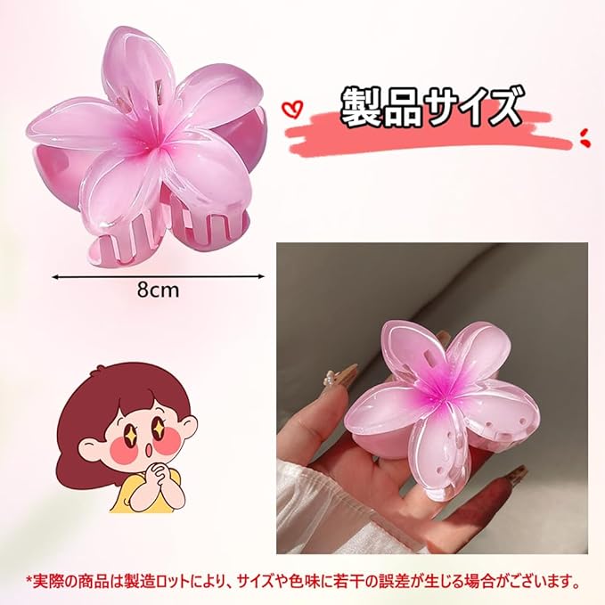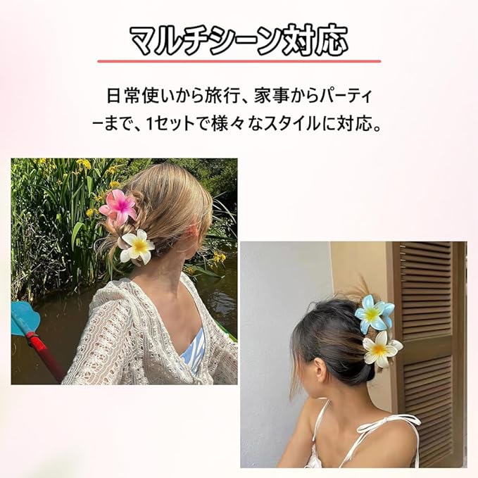 【ハワイアンリゾートスタイル】8cmの使いやすいサイズで、クラシックなプルメリア(ハワイの花)デザインを再現。アクリル製の立体花びらが、着けるだけで南国のビーチ気分を演出。