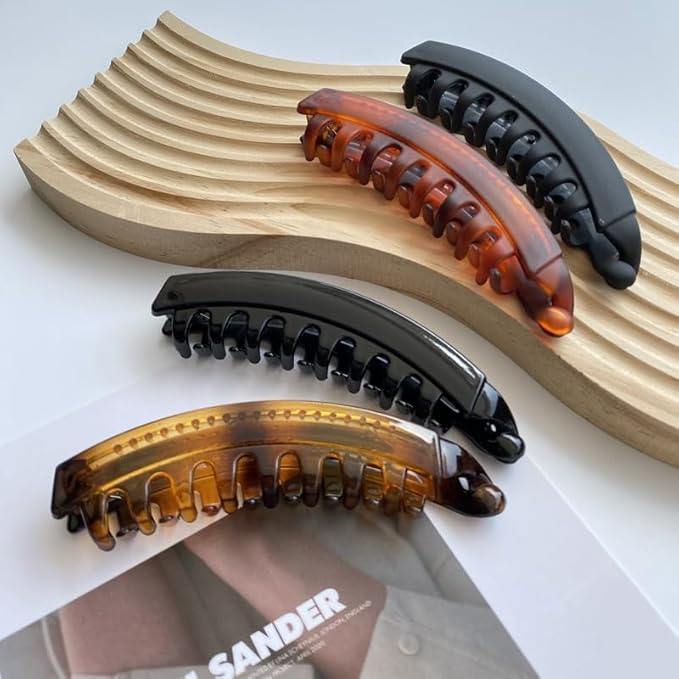 このバナナクリップは、動物柄やヒョウ柄のデザインが特徴的で、華やかな印象を与えます。軽量でありながら、縦型のカーブ形状が髪をしっかりとホールドします。大きめのサイズで使いやすく、光沢のある仕上げがスタイリッシュなアクセントになります。