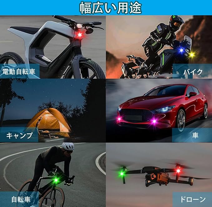 【幅広い用途】 車、バイク、ドローン、自転車、航空機、キャンプ、夜フィッシング、夜ランニング、山登り、RCモデルなど、様々な用途に使用できます