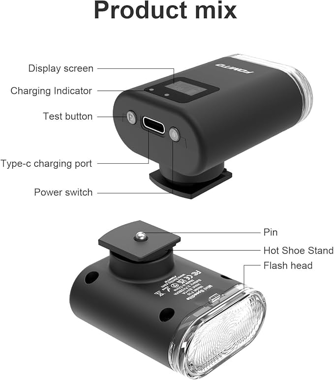 FOMITO カメラフラッシュ 撮影用ミニフラッシュMiniフラッシュスピードライト GN12 ストロボ 小型 カメラフラッシュストロボ スピードライト ストロボライト Type-C充電 ユニバーサルシングルコンタクト標準のホットシューマウント付き 12個カラーフィルター付属 保証1年(黒い‐5㎝)