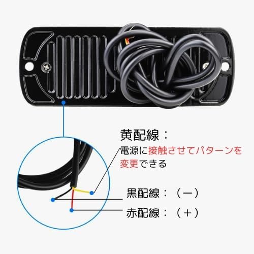 【さまざまな発光パターン】黒がマイナス、赤がプラス、黄色がブレーキランプのマイナスです。黄色は通常は通電しませんが、発光パターンを変える際に使用します。+に接触するたびにパターンが変わります。変更したパターンは固定になります。※日本語説明書は付属いたしません。また、使用方法についてのサポートは行っておりません。