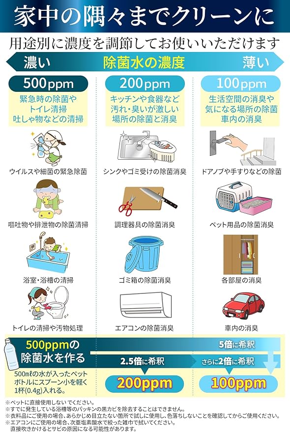 【希釈で様々な用途で活躍】嘔吐物などには500ppmで、加湿器除菌や空間除菌、身の回りの除菌、ゴミのニオイ対策やトイレの消臭など日常向けには2倍~10倍まで希釈してお使いいただけます。夏はプールの除菌としてもおすすめです。