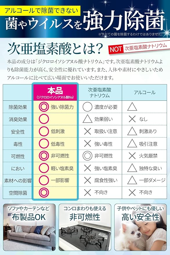 【メリットたくさん】長期保存(3年)でも品質の低下はほとんどありませんし、使うタイミングで生成できるので、液体タイプと違って「使うときには濃度(ppm)が下がっているかも」といった心配もありません。