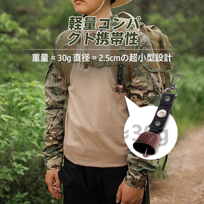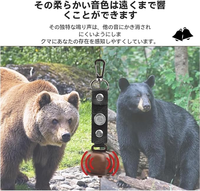 【熊遭遇防止】山林での歩行時に自然に音が響き、熊に人の存在を事前に知らせて遭遇リスクを低減。静かな環境でも過剰な騒音にならない適度な音量設計。
