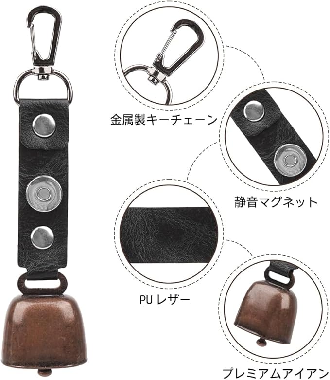 【マグネット式消音機能付き】公共交通機関や集落通過時は、ベルを付属革ベルトのマグネットに着磁すれば即消音。登山道再開時は外すだけのワンタッチ操作で、煩わしい脱着作業なし。