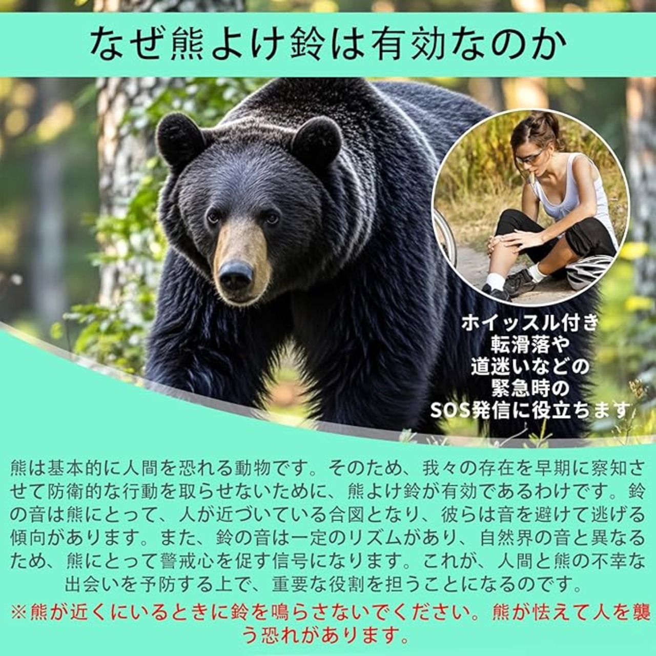 【レスキューホイッスルつき】転滑落や道迷いなどの緊急時のSOSを発信することができます。防災時の備えとしても安心です。熊鈴対策と組み合わせることで、より安全な登山やアウトドアを楽しむことができるでしょう。