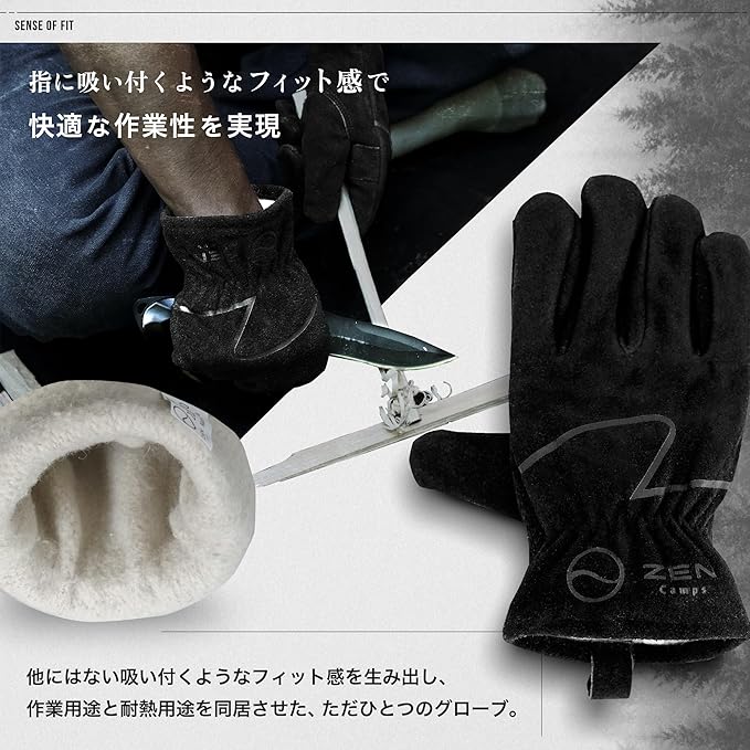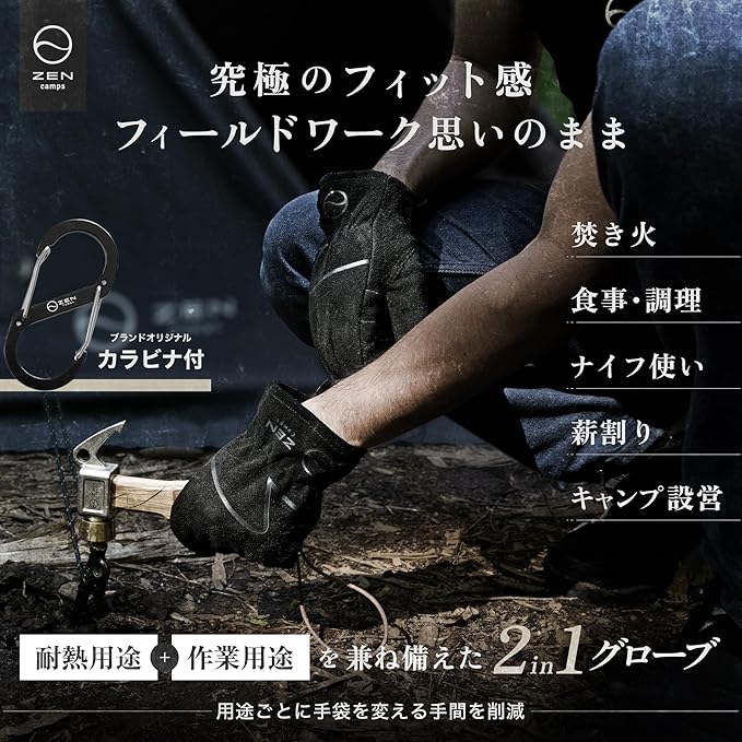 【材料】手袋本体:牛革 裏地:100%綿 ZEN Camps 耐熱性と作業製に優れたキャンプ専用グローブ。キャンプ用、アウトドア用 、BBQ用に最適です。