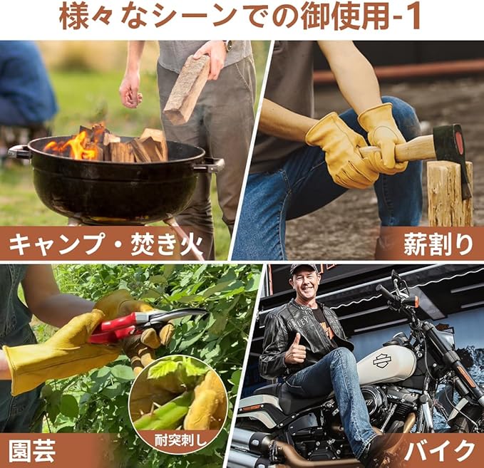 【様々なシーンでの御使用】工場:作業、溶接、荷物運び;アウトドアとキャンプ;焚き火、薪割り;バイク;庭仕事:手斧、電鋸、鋏を使用する場合、手をしっかり手を保護してくれる;その他、廃棄物処理、地震、災害 時の救援作業時や、防災用品の中にも是非備えていただくことをおすすめします。