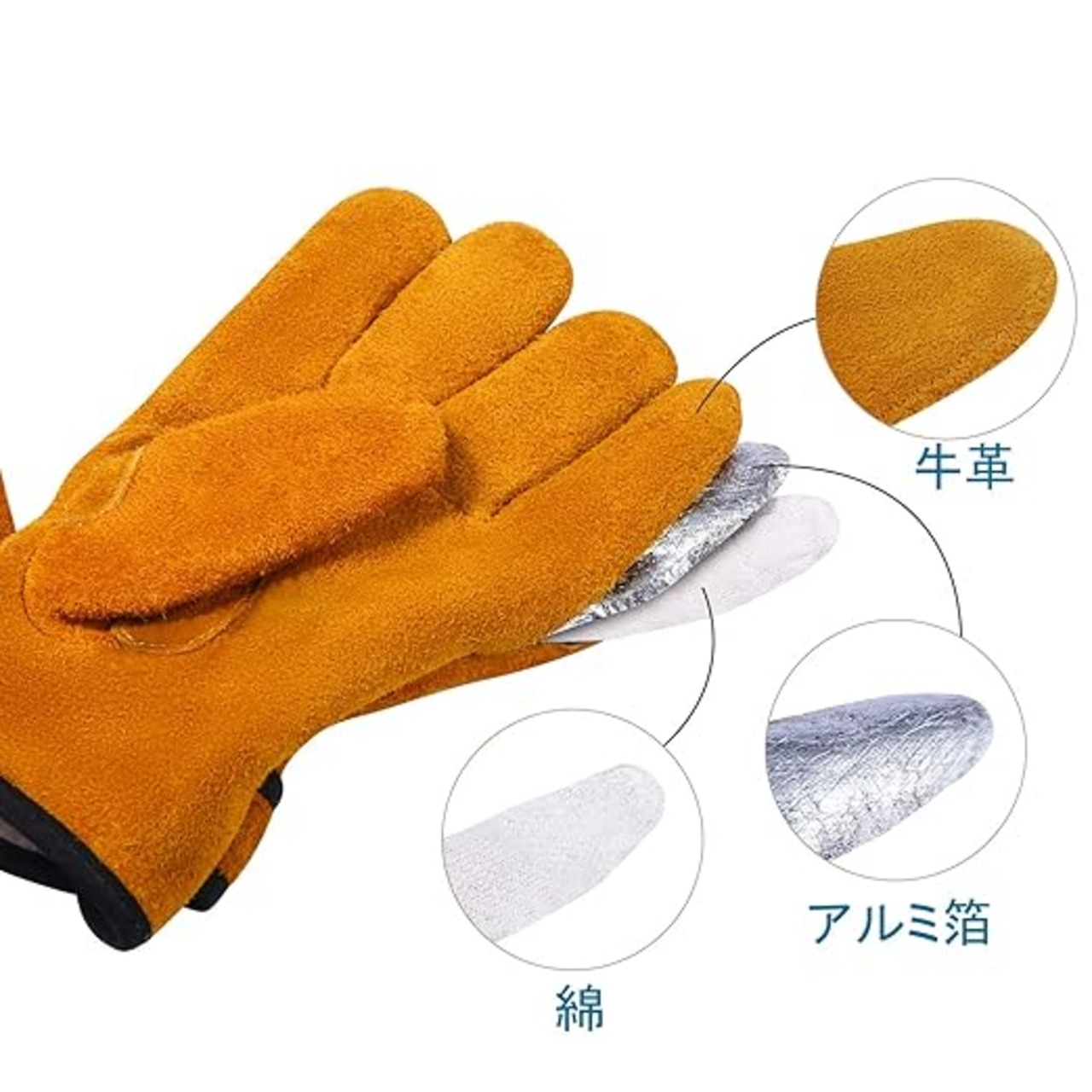 中間素材 : 当社独自の手袋デザインで、中に高温に耐えるアルミ箔を設置しているため、手袋の耐熱性を高めています。手袋の最高耐熱温度は350℃で、持続的な接触時間は10秒です。