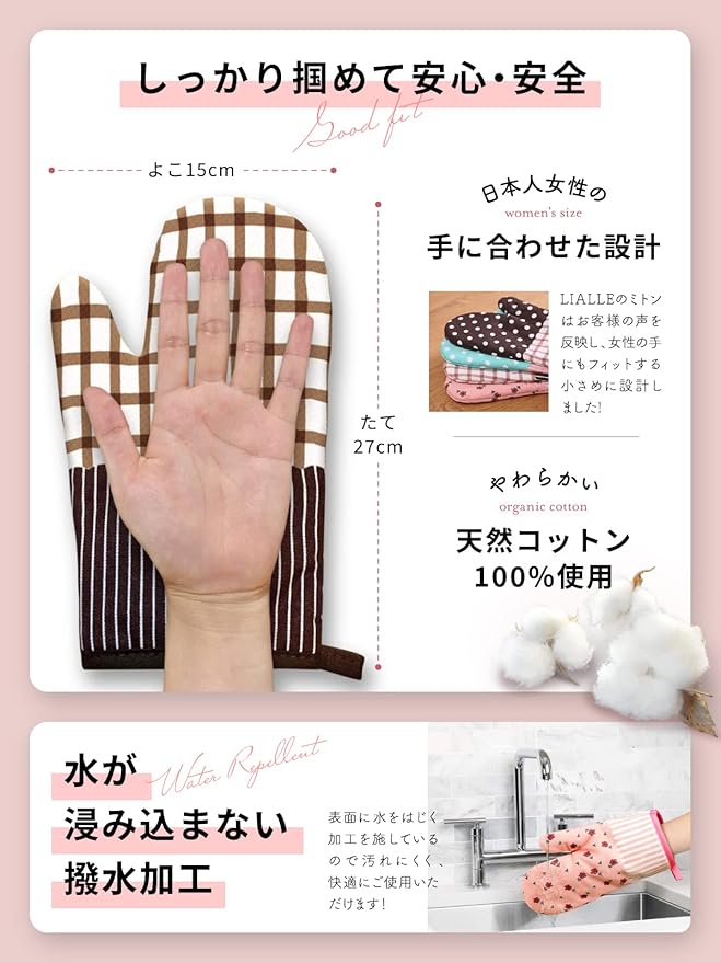 材: コットン ミトンのサイズ:29.5*18.5*3 cm 耐熱温度:260℃ 重量:185g パッケージ内容: 耐熱ミトン *2(ブラウンチェック/ブラウン/ミントブルー/チェリーピンク)