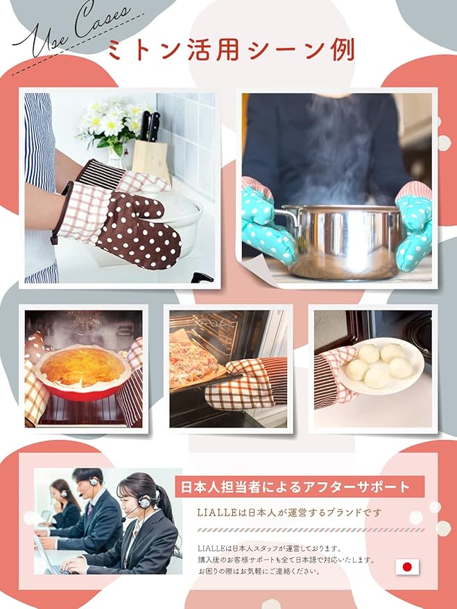 ✅【幅広い用途】LIALLEの鍋つかみは、断熱・耐火加工を施しているため、普段の料理でのなべつかみ、オーブンや電子レンジで熱した容器の取り出し、その他にもホームベーカリー、バーベキュー、アウトドア等の幅広い場面で活躍します。