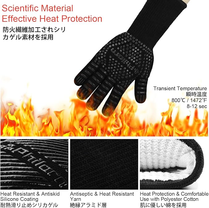 【二重構造・耐熱最高温度:800℃】 鍋つかみ耐熱ミトンは二重構造となっており、外部には、耐熱、耐刃に優れた防火繊維と加工されたシリカゲル素材にて熱遮断バリアを形成し、優れた耐火&耐熱効果を持って、800℃の高温から両手を守る耐熱ミトンです(瞬間温度)。内部層は綿100%の上質な生地を使用し、伸縮性、通気性が良いため夏場や長時間の使用でも快適に使えます。