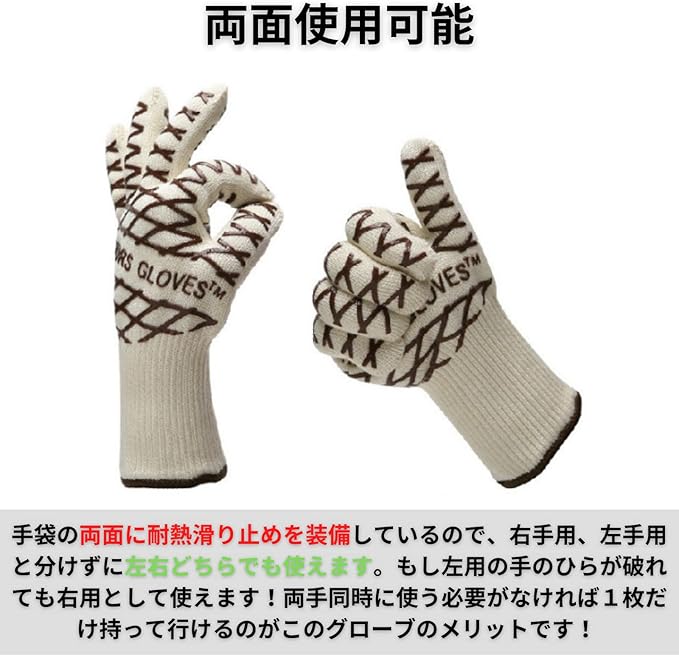 【両面使用可能!】手袋の両面に耐熱滑り止めを装備しているので、右手用、左手用と分けずに左右どちらでも使えます。もし左用の手のひらが破れても右用として使えます!両手同時に使う必要がなければ1枚だけ持って行けるのがこのグローブのメリットです!