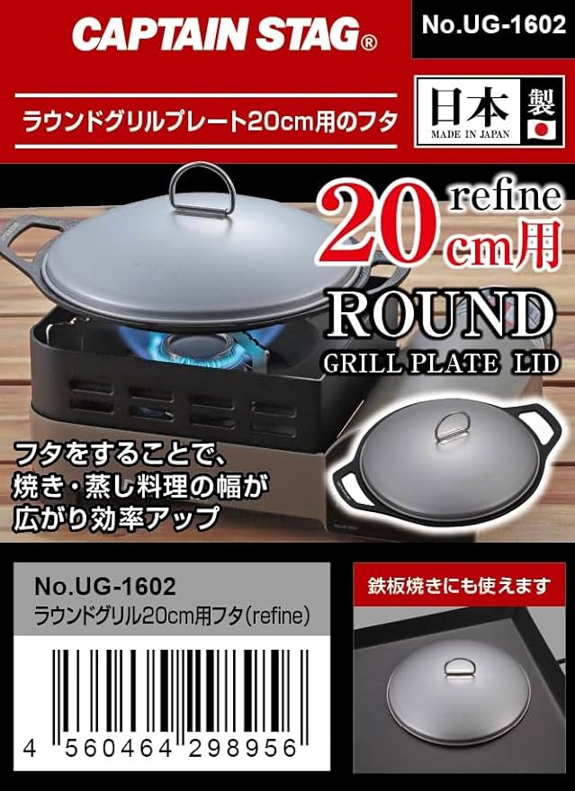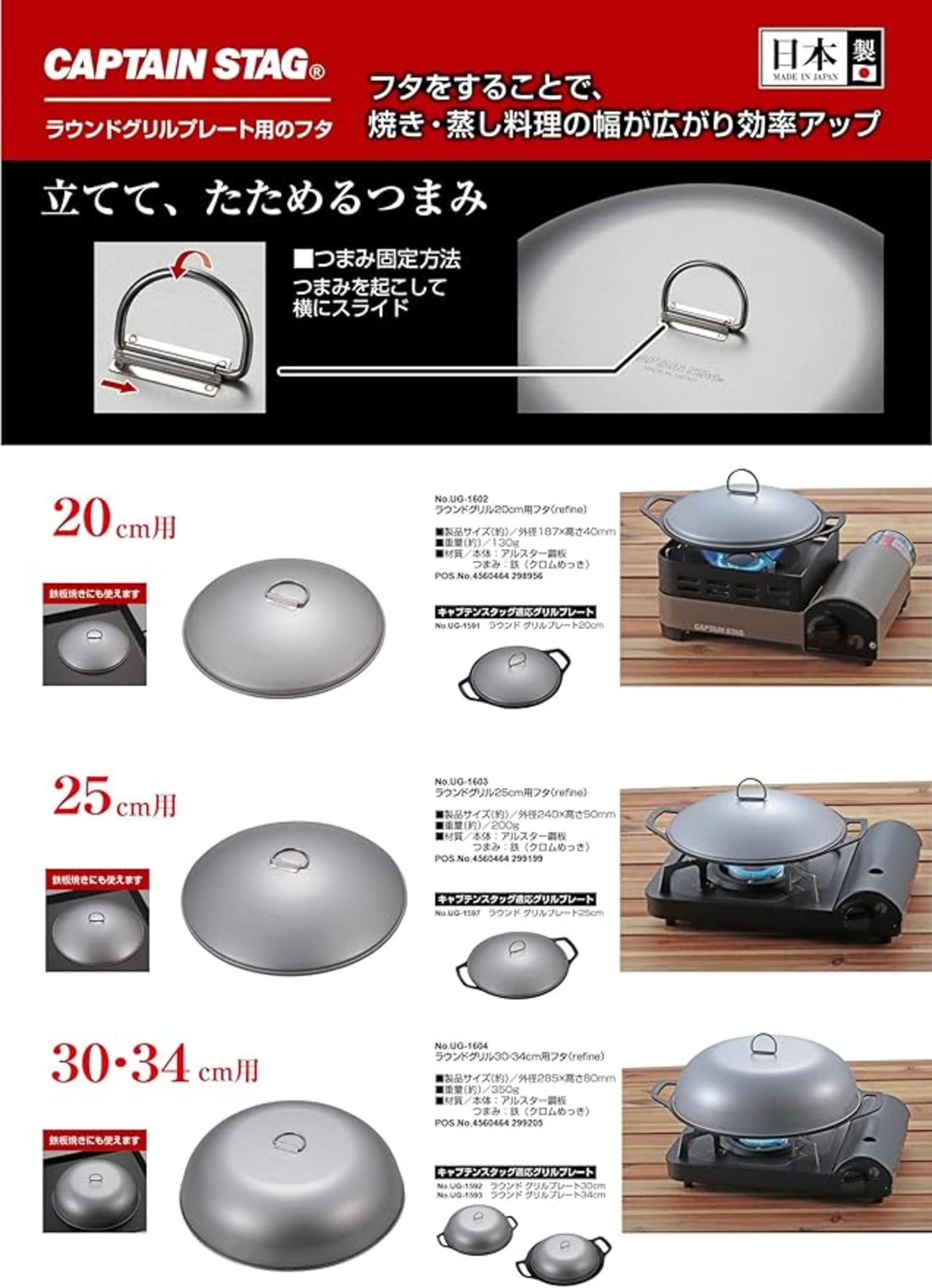 特徴:ラウンドグリルプレート20cm用のフタ。フタをすることで、焼き・蒸し料理の幅が広がり効率アップ。鉄板焼きにも使えます。立てて、たためるつまみ。