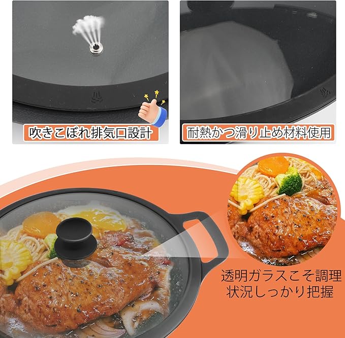 ✅【調理物丸見え】ガラス蓋だから食材の火の通り具合や、裏返すタイミングがひと目でわかるのが使いやすい。またある程度の重みがあるのでフタも浮きにくく、安心安全