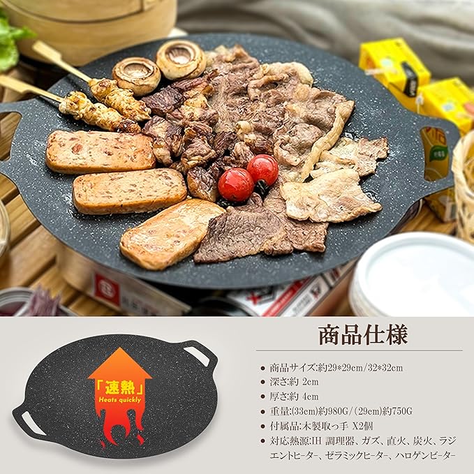 BEIKEMALL マルチグリドル 深型 鉄板 直径29cm/33cm グリルパン 特殊コーティング 焚き火 ガス/IHなど様々な調理方法に対応 お手入れ簡単 木製取っ手&収納バッグ付き (直径33cm)