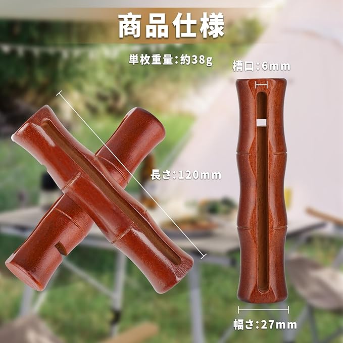 【マルチグリドル 取っ手 木製】サイズ:長さ:120mm、幅さ:27mm;重量:約76g(2本あたり)。この最新改良型の取っ手カバーは、横滑り防止のデザインを採用して、JHQ社製「鉄板マルチグリドル33cm」専用に設計されております。