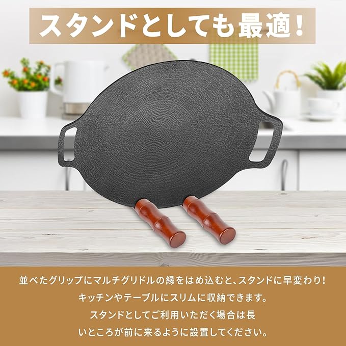 【鉄板取っ手】グリップ(取っ手)/スタンドの2wayでご使用いただけます。 <グリップとして>持ち手にはめるだけでグリップに。<スタンドとして>並べたグリップにマルチグリドルの縁をはめ込むと、スタンドに早変わり!JHQ マルチグリドルのハンドルに合わせて、高温の伝導を効果的に隔離し、手を熱源から遠ざけ、シンプルなひし形の木製取手です。