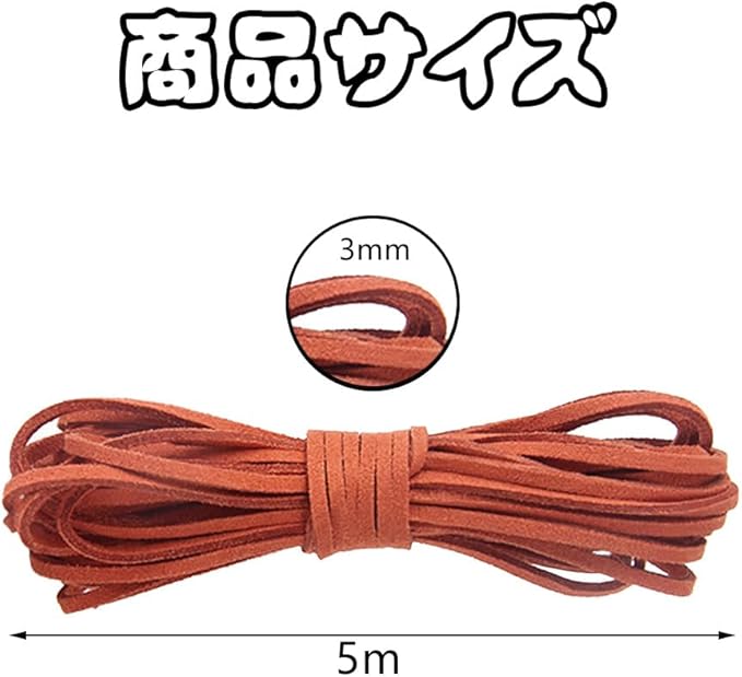 【数とサイズ】パイルレザーコード5巻をお選びいただけます。縦5 m、幅3 mm、厚さ1.5 mmの5種類のカラーがあり、各カラーは1巻。
