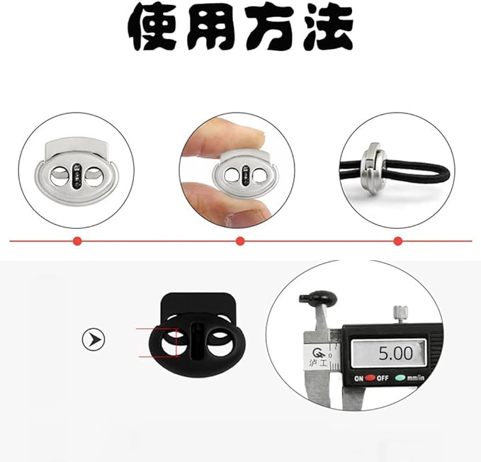 【サイズ詳細】ダブルホールコードロック(各穴径:5mm)、長さ*幅22*20mm。ジッパープルコードロックコード 長さ17.3mm。弾性バンジーナイロンショックコードは、幅2.5mm、長さ10m。