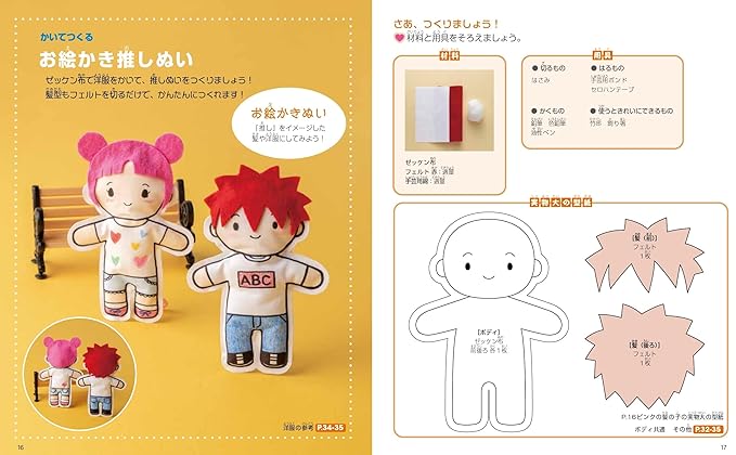 針も糸も使わず、ゼッケン用の布に絵をかいて、ボンドではるだけでできる「推しぬい」とマスコットのいちばんかんたんな作り方の本です。