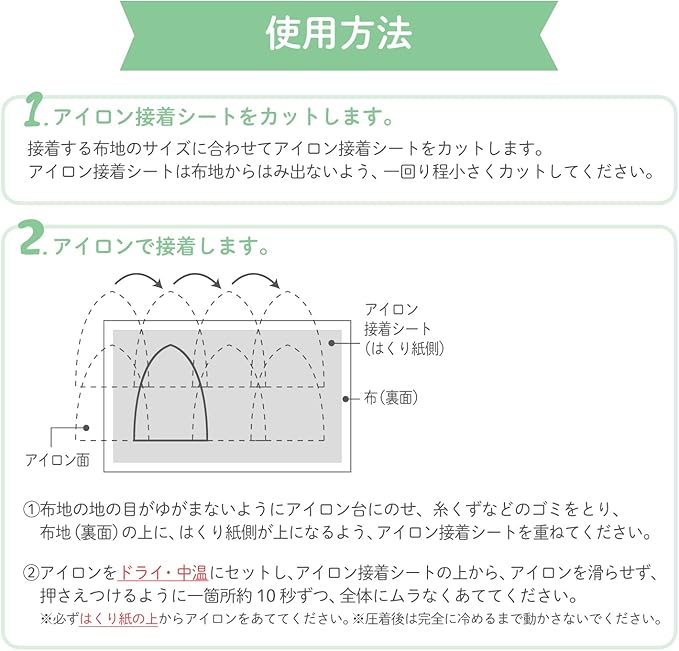 ※接着フィルム(さわるとひっかかりがあります)にアイロンが当たるとフィルムが溶けてアイロンが汚れます。