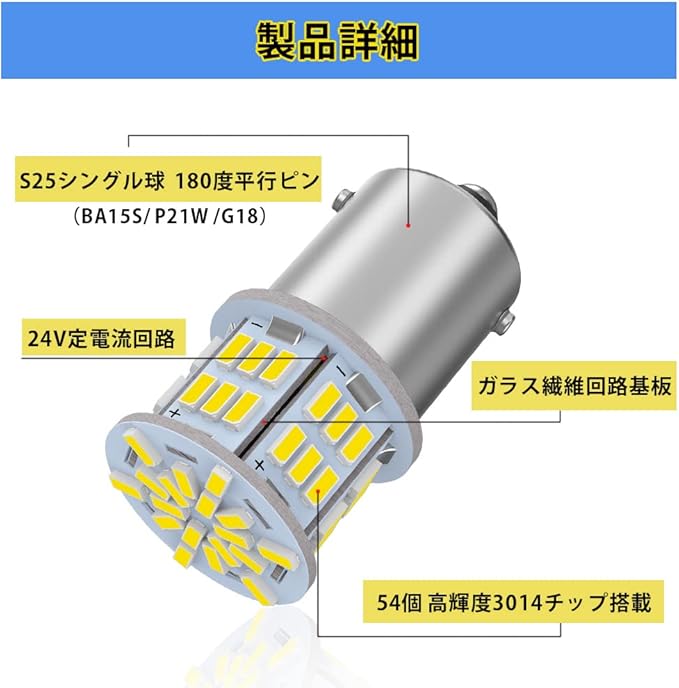 【24V S25 LEDシングル ホワイト】24V大型車に適用。定電流回路搭載なので、車両電圧の変化に影響されず、安定した点灯を持続します。『ご注意:12V自動車とバイク使用不可』.