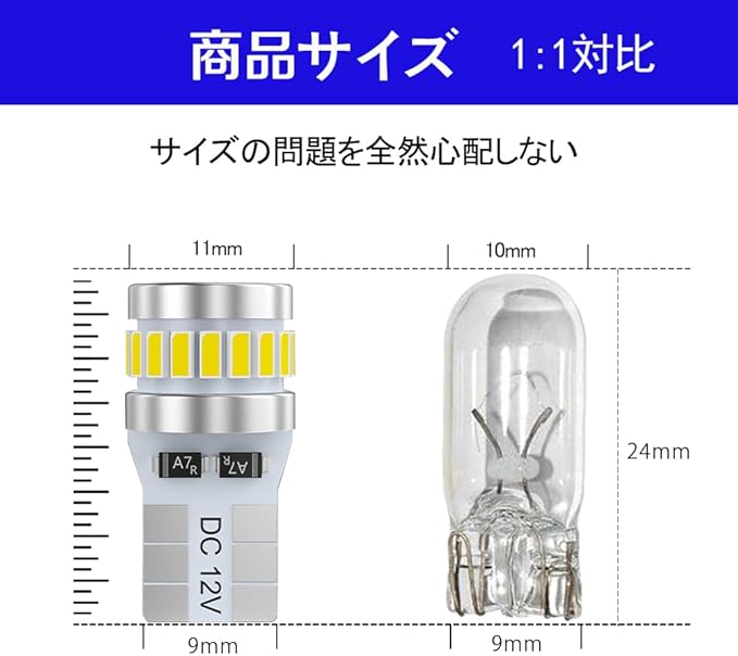 形状:T10 (タイプ:147, 152, 158, 159, 161, 168, 175, 184, 192, 193, 194 2825 2827 W5W) などを直接に切り替えでき 、純正球(T10)とほぼ同じサイズなので、ルームランプ、バックランプ、ポジション灯、クリアランスランプ、メーター球、スモール、ストップランプ、ブレーキランプ、テールランプ、ライセンスランプなどとして使用します。