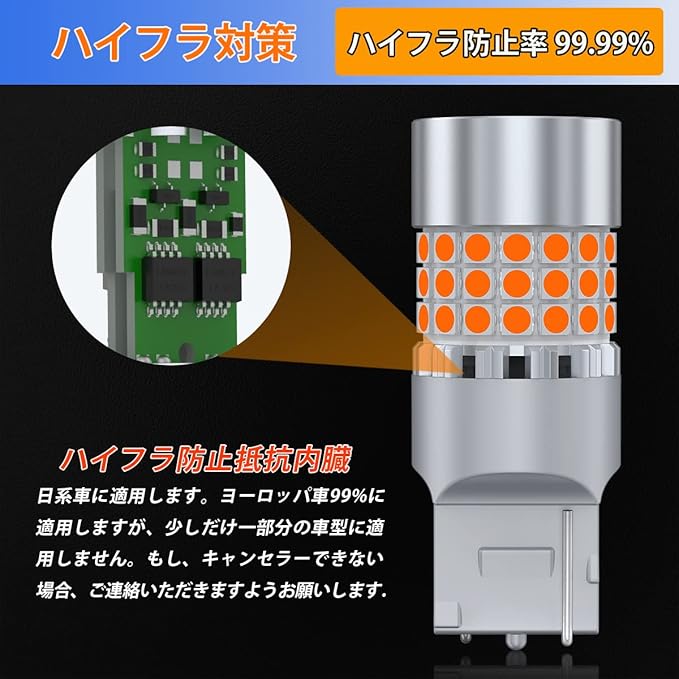 ★【ハイフラ対策&取り付け簡単】ハイフラ防止抵抗内蔵(ハイフラ防止率99.99%)ハロゲンランプをLEDウインカーに交換する際に、通常車体側に抵抗を接続しないとウインカーが高速点滅するハイフラ現象が起きますが、本製品は小型のハイフラ抵抗をバルブ内に内蔵していますので加工必要ございません、ハイフラ対策必要ございません。ノイズ対策済みでFMラジオへの電波干渉によるノイズが発生しません。無極性 +、ーどちらに差し込んでも点灯します、大変強い光を発する超高輝度LEDとなりますので絶対に直視はしないでください。