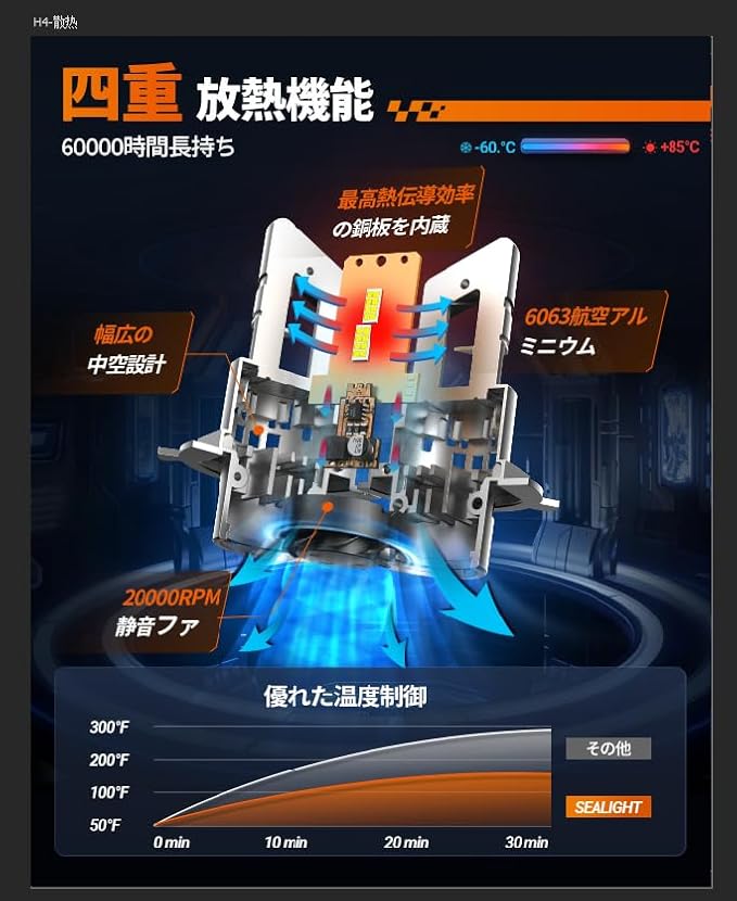 【四重放熱で長寿命化】20000PRMの高速ファン、4つの広い中空設計、内蔵銅基板、6063航空アルミニウム素材、これら4つの冷却設計は寿命を大幅に向上させ、発熱による光の減衰問題も解決! 20000PRMの高速ファンが稼働し、寿命を延ばし、ノイズもなく、連続して照射しても暗くなりません。 4つの広い中空設計と底座の中空設計を拡張し、冷却面積を広げました。 内蔵の銅基板と6063航空アルミニウム素材+底座のネジ補強により、この製品は優れた冷却効果と安定した性能を提供し、60,000時間の信頼性のある使用を保証します。 このLEDライトは長寿命でありながら、冷却機能も充実しています。暗くならずに連続して使用できるため、お客様のニーズにしっかりとお応えします。是非この機会にお試しください!