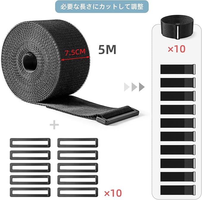 Trilancer 5m x 7.5cm 強力マジック結束バンド 10個のバックル付き – 調節可能、必要な長さにカット可能、再利用可能なストラップで、ケーブル、ホース、パイプ、自転車、荷物、キャンプ用品、パネル、フェンスなどをしっかり固定できます