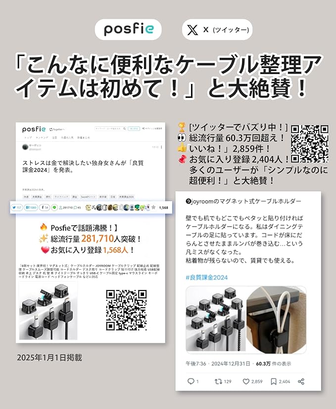 JOYROOM ケーブルホルダー「6個セット 業界初!マグネット式」 ケーブルクリップ 配線止め 配線整理 ケーブルスムーズ調整可能 コードホルダー デスク周り コードクリップ 貼り付け 強力粘着 USB配線収納 卓上 デスク 机 壁 車 ナイトテーブル すっきり USB-C ケーブル固定 type-c マウスライン キーボードライン 電源コード ヘッドフォンケーブル などに対応