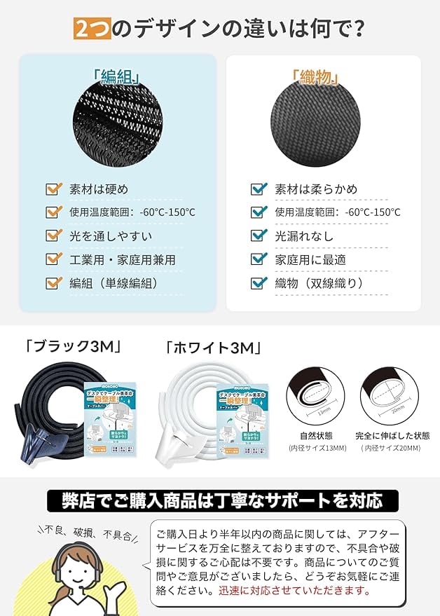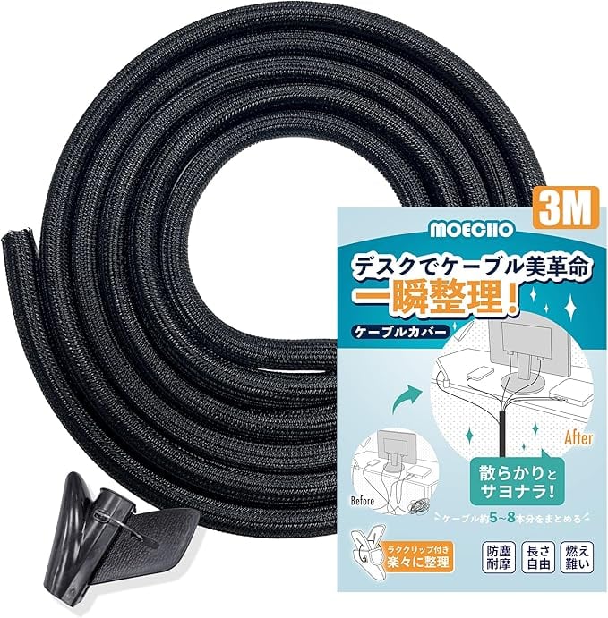【スプリッティング設計・自由な長さ】スプリッティング設計により、このケーブルカバーは従来のように端から通す手間が不要になり、側面から簡単にケーブルを挿入することができます。また、お好みの長さにカットして使用できるため、用途に応じて適切なサイズで配線隠しの保護効果を上限までに発揮します。さらに、カット後のほつれを防ぐために、ライターで軽く炙ることを推奨します。使いやすさと実用性を兼ね備えた設計で、ケーブルのまとめることと保護をスマートにサポートします