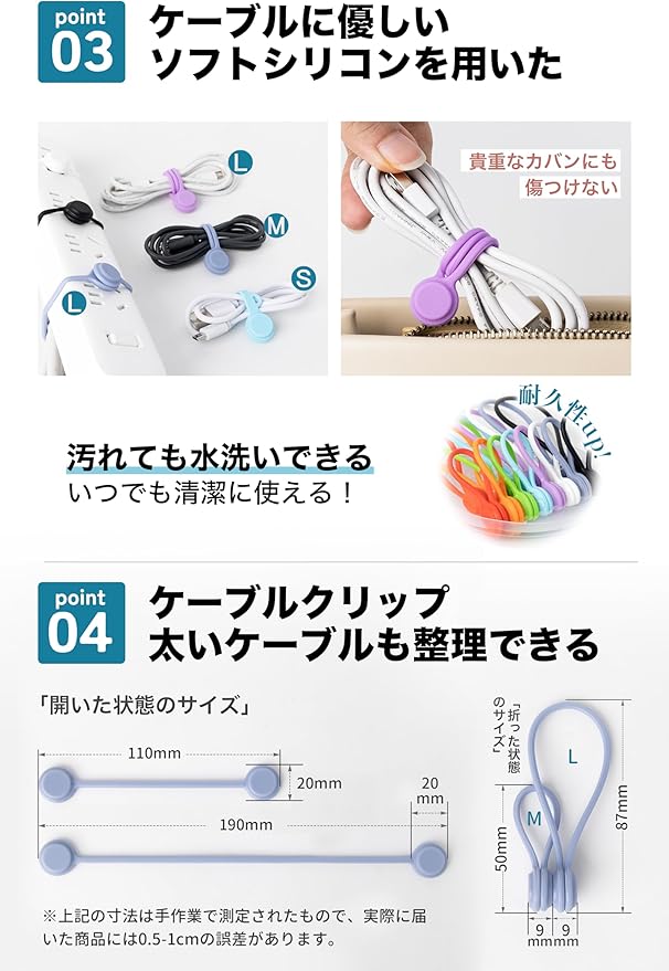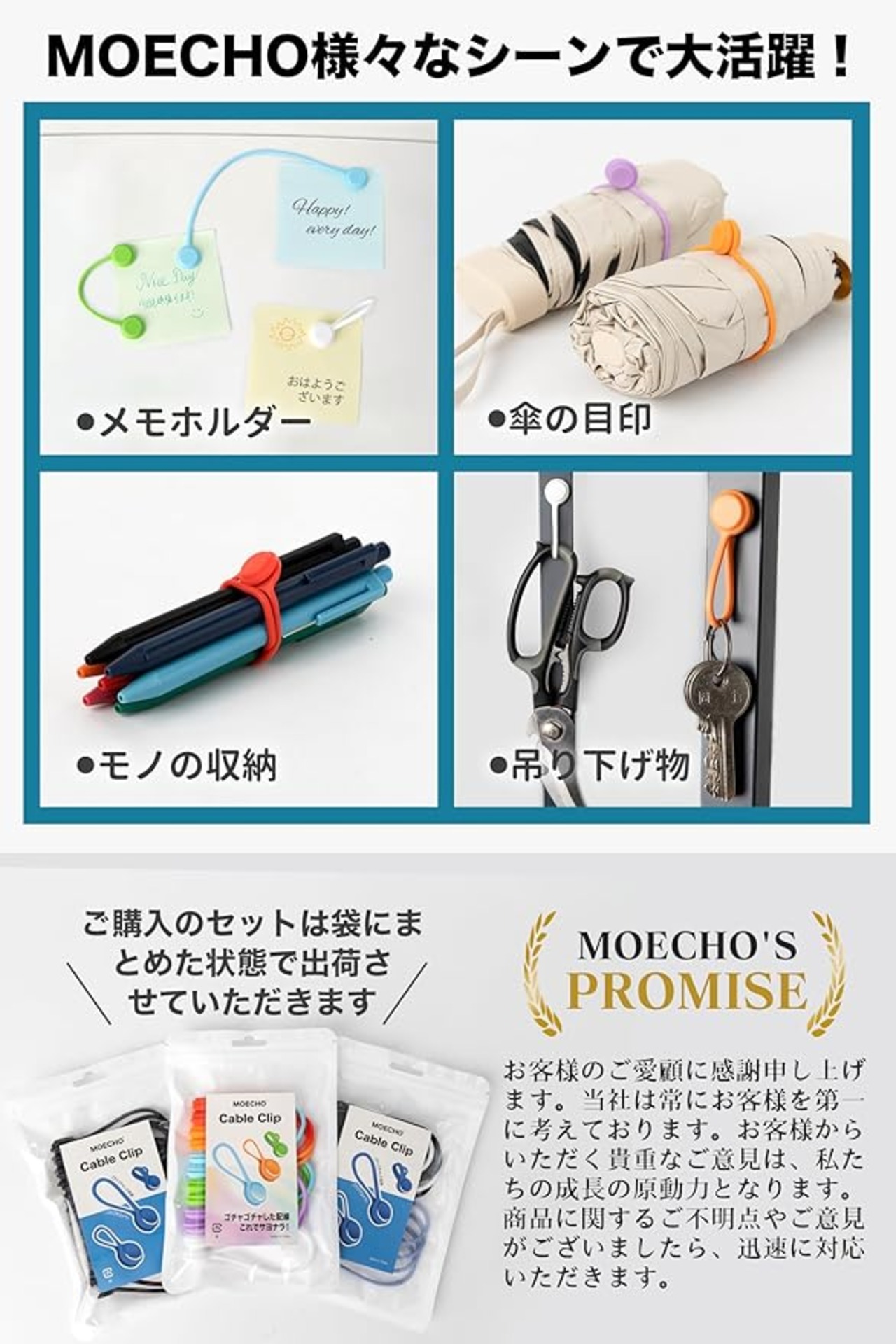 【アイデア次第・使い方無限大】配線整理グッズとしてだけでなく、栞やフォトクリップ、キーリング、袋止め、そして冷蔵庫のメモクリップなどとしても活用可能です。さらに、卓上やホワイトボード、車内、キッチンなど、様々な場面で役立ちます。使い方はお客様次第で、無限の可能性がありますので、ぜひ独自の使い方を見つけてみてください