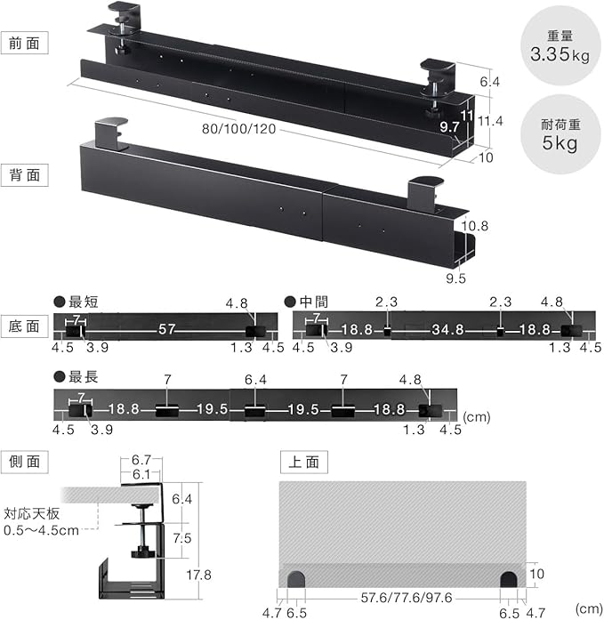 サンワダイレクト ケーブルトレー 横幅調整可 80/100/120cm デスク下 クランプ固定 スチール製 耐荷重5㎏ マグネット ケーブルオーガナイザー 配線 整理 ブラック 200-CT009BK