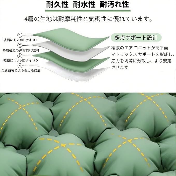 【アウトドアに強い耐久性,汚れも簡単清掃】耐摩耗性・耐水性に優れた素材を使用し、キャンプグッズとしても、アウトドア用品に適した長期使用に耐えます。少しの汚れは拭き取りで簡単に除去でき、レジャーシートとして使った後の手入れもラクです。3 イン 1 エアポンプ部分も防水構造なので、旅行の便利グッズとして携帯し、釣りや野外ライブなどのアウトドアシーンでも支障なく使用できます。