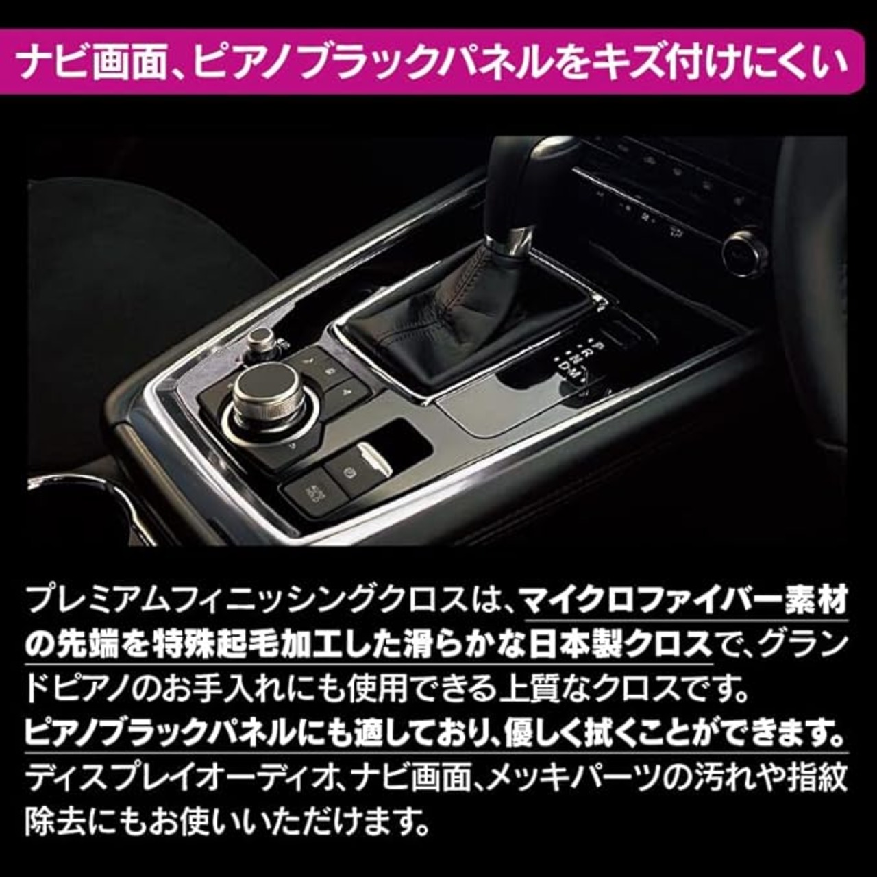 ナビ画面、ピアノブラックパネルをキズ付けにくい。プレミアムフィニッシングクロスは、マイクロファイバー素材の先端を特殊起毛加工した滑らかな日本製クロスで、グランドピアノのお手入れにも使用できる上質なクロスです。 ピアノブラックパネルにも適しており、優しく拭くことができます。 ディスプレイオーディオ、ナビ画面、メッキパーツの汚れや指紋除去にもお使いいただけます。