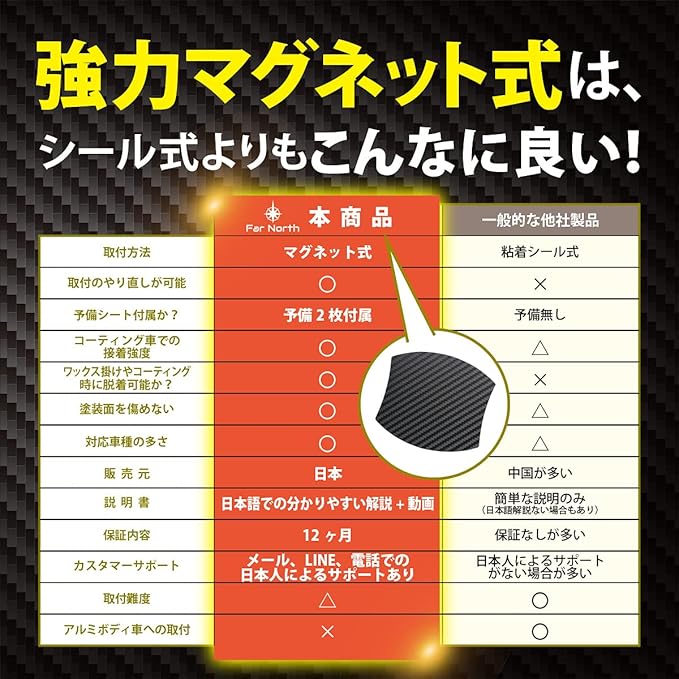 ●貼付面は、シリコンでコーティングされているので、マグネットゴムに含まれる可塑剤や鉄粉が直接ボディに触れることがなく、塗装を傷めません。●表面は、おしゃれなカーボンシート調です。