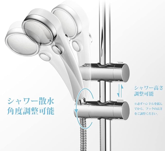 [高さ・角度自在調節] スライドバーの受け部にシリコンパッドのデザインを採用することで、軽くてスムーズにフックを上下スライドできます。シリコンパッドが柔らかいので、バーに傷つかなくていてでもキラキラしています。シャワーヘッド掛け部は360℃回転できるので、散水角度も自由に調節可能です。