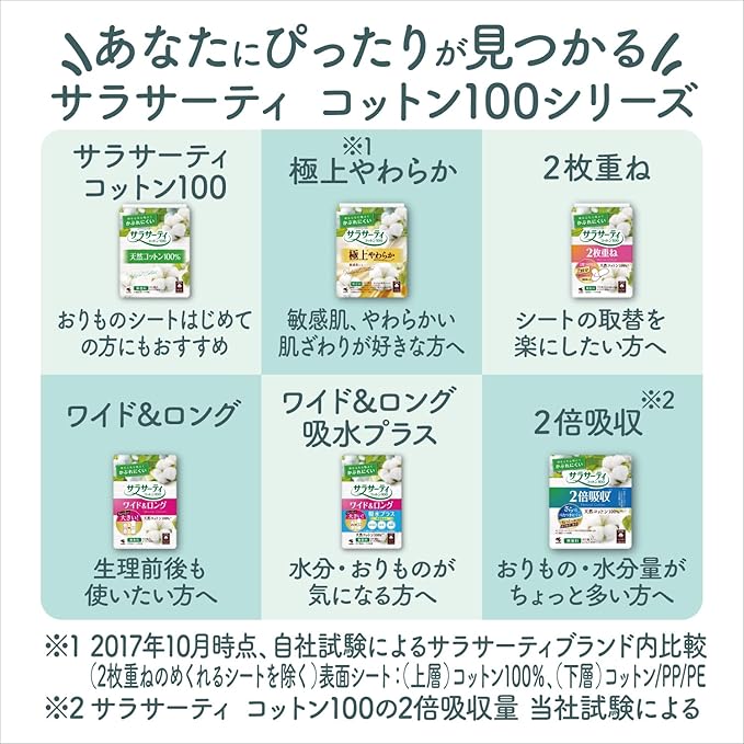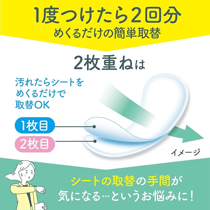 ●シートが2回分になっている、おりものシートです。●清潔感のある「ソープの香り」がついた、おりものシートです。●汚れに気づいた時にめくるだけで、その場で清潔な新しいシートになります。●シートをめくっても、フレッシュ感を感じる香りが続きます。●シートの替えを持ち歩かなくても、手軽に替えられます。