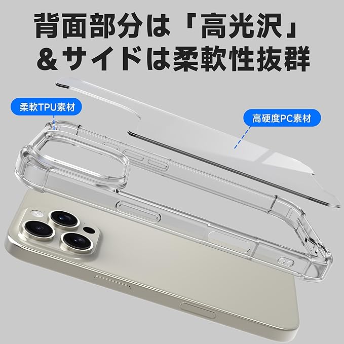 【水晶のような透明感】 究極の透明感を追求し、最新の抗黄変技術を採用することで、本体の鮮やかな色をそのまま映し出すことができ、本体のオリジナルのカラーを損ねません。サイドのTPUは優れたTPU材料を採用し、柔軟に変形しない、着脱しやすい、耐衝撃、指紋の汗を防ぎ、触感が良好であります。